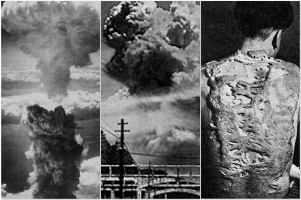 Explosions d’Hiroshima et Nagashaki, et photo d’une femme qui y a survécu mais porte sur son dos les restes d’une personne calcinée