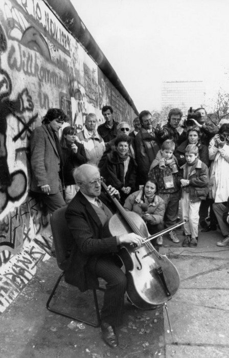 Au lendemain de la chute du mur de Berlin, le violoncelliste russe Mstislav Rostropovich improvise un petit concert, assis sur une chaise.