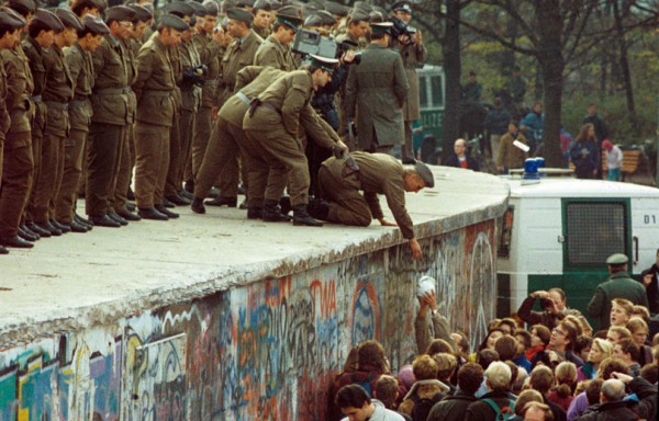 Solidarité entre les soldats ouest-allemands et la population de l’est en train de détruire le mur de Berlin