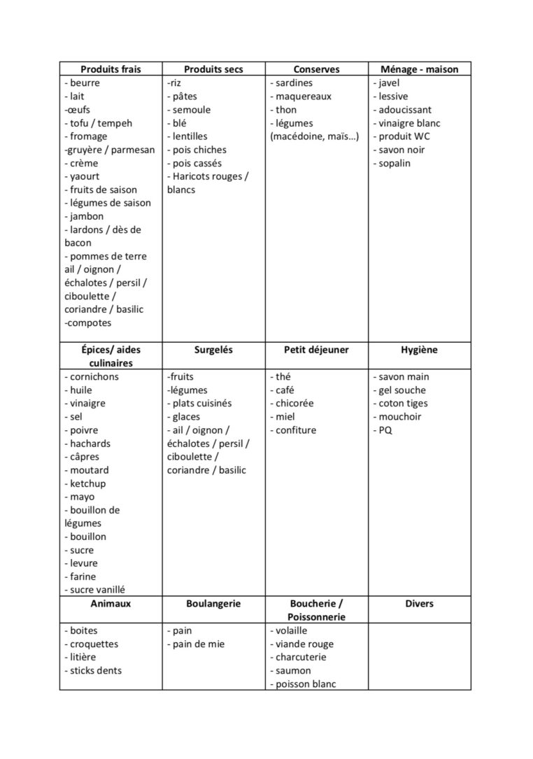 Faire une liste de courses a de nombreux avantages. Grouper la liste des courses par catégories permet de mieux s’organiser. En effet, si vous utilisez notre liste de courses à imprimer vous remarquerez un gain de temps; puisque vous réduirez les allers-retours dans les rayons. Pour éviter de perdre du temps, avancez rayon par rayon plutôt que de suivre votre liste dans l’ordre, car certains rayons sont très éloignés.