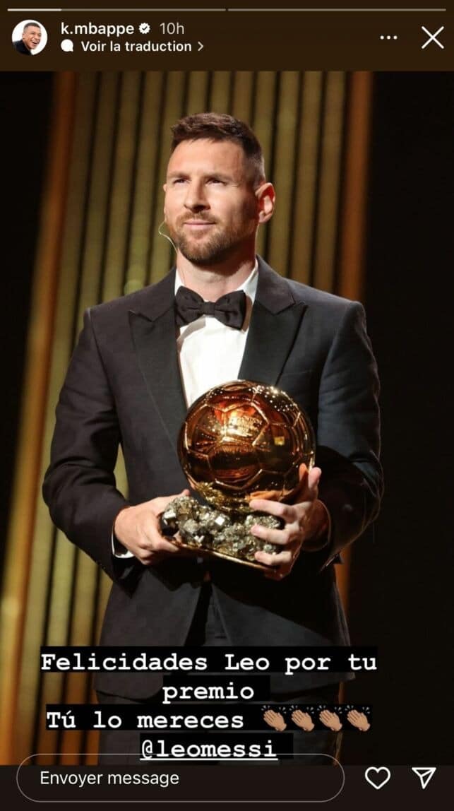 Après avoir brandi le trophée de la Coupe du monde en 2022, l’Argentin de 36 ans a été sacré Ballon d’Or pour la 8e fois au Théâtre du Châtelet à Paris. De quoi agacer les supporters du numéro 10 des Bleus. KM7 a pourtant tenu à féliciter la star de l’Albiceleste.