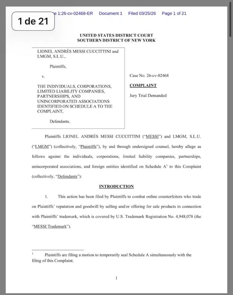 C’est via sa société LMGM S.L.U. que Lionel Messi a lancé les poursuites. Le dossier a été enregistré auprès du tribunal fédéral du district sud de New York, l’une des juridictions les plus réputées des États-Unis pour les affaires de propriété intellectuelle.