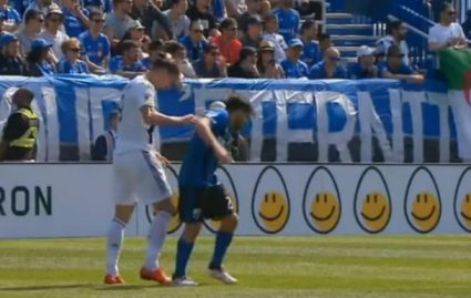 Les sportifs sont connus pour leurs exploits, mais pas que… Le dernier en date à avoir fait parler de lui n’est autre que Zlatan Ibrahimović. Le joueur du Galaxy de Los Angeles a en effet giflé un joueur de Montréal, Michael Petrasso. Ce n’est pas très classe, mais on peut imaginer qu’il avait sûrement une bonne raison ? Il n’en n’est rien du tout. Comme le montre la vidéo, le joueur de football Montréalais (en bleu) recule un peu trop près de Zlatan. Ce dernier va rapidement lui faire comprendre que cette proximité le gonfle. Et il le baffe assez violemment à l’arrière de la tête. Au vu de la taille de Zlatan et de celle de Petrasso, on imagine que ça a dû piquer un peu pour le joueur de Montréal.
