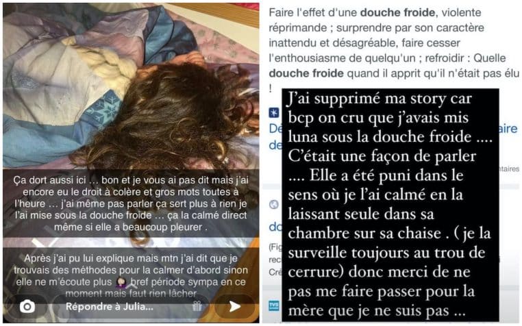 Ce samedi 2 avril, la jeune maman a publié une story Instagram. Elle s’est rapidement attiré les foudres des internautes. Alors que sa fille était turbulente, Julia Paredes explique comment elle l’a punie. « J’ai encore eu le droit à colère et gros mots tout à l’heure… Je n’ai même pas parlé, ça ne sert plus à rien. Je l’ai mise sous la douche froide. Ça l’a calmée direct, même si elle a beaucoup pleuré » .