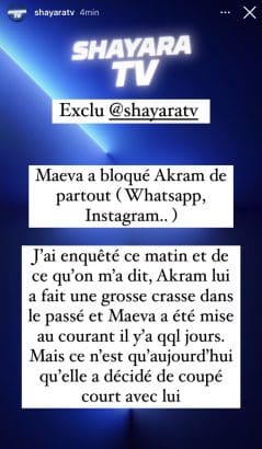 Alors que depuis plusieurs jours maintenant, il y a des tensions entre Maeva Ghennam et son meilleur ami Akram, la blogueuse @shayaratv, a rĂ©ussi Ă dĂ©nicher quelques petites informations sur leur brouille : « Maeva a bloquĂ© Akram de partout. Whatsapp, Instagram⊠Jâai enquĂȘtĂ© ce matin. Et de ce quâon mâa dit, Akram lui a fait une grosse crasse dans le passĂ©. Et Maeva a Ă©tĂ© mise au courant il y a quelques jours. Mais ce nâest quâaujourdâhui quâelle a dĂ©cidĂ© de couper court avec lui » .