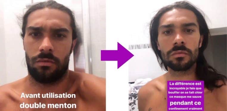 Revenons en avril 2020 quand Julien Guirado faisait la publicité d’un masque censé faire disparaître votre double menton. Le candidat de télé-réalité a fait un avant/après qui est selon lui flagrant.