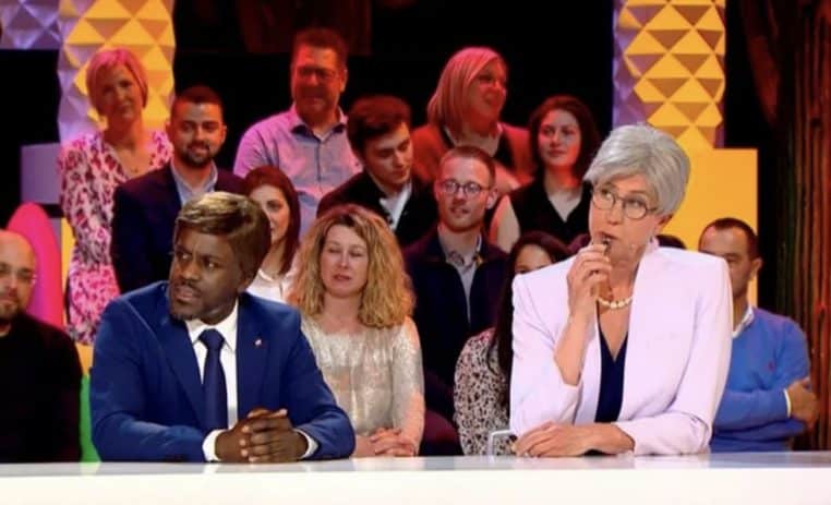 S’exposant en costume bleu et coupe de cheveux travaillée pour l’un ainsi que tailleur rose et cigarette électronique pour l’autre, Isabelle Hauben et Kody Kim ont joué le jeu à fond. Après avoir été accueillis en plateau avec le Chant des partisans et les huées du public, ils ont ensuite pu répondre aux questions de Jérôme de Warzée qui s’est lui-même lancé dans un édito comique : « un peuple français en colère, un peuple français qui gueule, un peuple français, quoi… ».