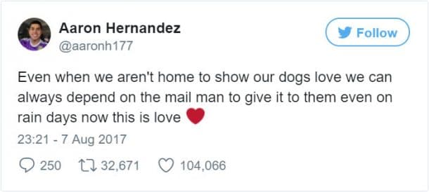Aaron Hernandez vit à Houston, au Texas. Le jeune homme a 5 adorables chiens et a découvert quelque chose d’inhabituel en visionnant sa caméra de surveillance. Et pour cause, il s’est aperçu que le nouveau facteur prenait le temps de saluer chacun des chiens, tous les jours. D’ailleurs, sur la vidéo, on le voit très clairement donner une caresse à chaque toutou. Comme quoi le mythe des chiens qui détestent les facteurs n’est pas toujours vrai. Et heureusement ! Hernandez fut touché par un tel geste et a donc posté la courte vidéo sur Twitter. Il ajoute : « Je pense que c’est quelqu’un de vraiment très attentionné et aimant pour qu’il prenne le temps de faire ça sur ses journées bien chargées ».