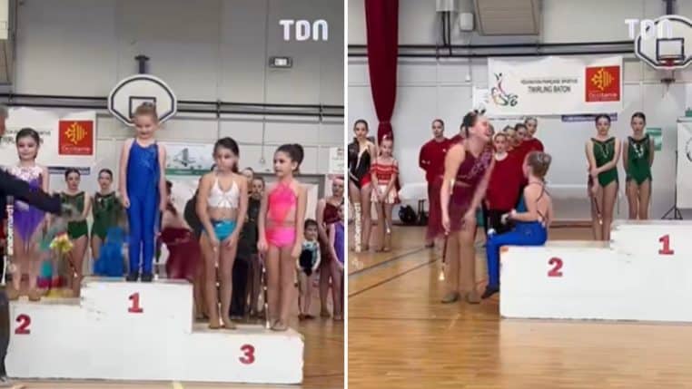 Alors qu’un podium était prévu pour récompenser les trois premières, les enfants semblaient un peu perdues. La gagnante, visiblement pas au courant du principe d’un podium, passe carrément à côté sans y prêter attention. Une membre du jury doit alors l’interpeller pour lui demander de monter dessus. Une fois tout en haut, la petite affiche un air totalement perdu qui fait sourire tout le monde.