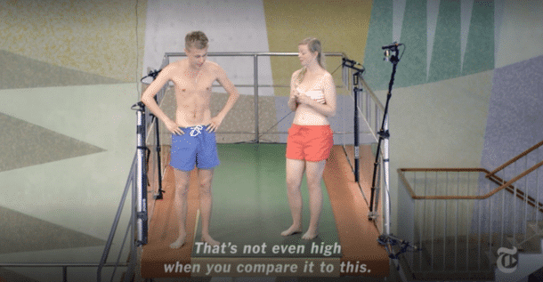 La vidéo de l’expérience « Ten Meter Tower », menée en Suède, a été projetée au Sundance Film Festival. Elle a pour but de montrer les réactions de doute des hommes et des femmes lorsqu’ils se retrouvent en situation difficile. Même si chacun réagit différemment, il y a aussi de nombreuses similitudes dans la manière de se comporter. L’expérience menée sur un plongeoir à 10 mètres de hauteur, prouve que nous sommes bien des poules mouillées.