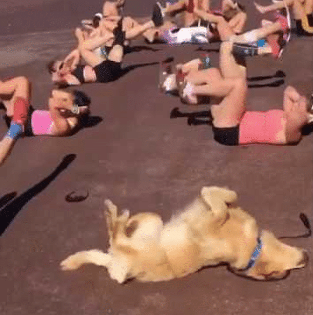 Mais là, Riptide, un adorable Golden Retriever ne pas embêter personne pendant ce cours de sport. Il va juste imiter ces femmes et c’est à mourir de rire. Bien évidemment, il fait n’importe quoi en se roulant sur le dos et on a même l’impression qu’il se moque d’elles ! En réalité, loin de lui cette idée, il doit plutôt être en train de s’éclater comme un petit fou. On espère qu’il aura un corps de rêve pour l’été 😉