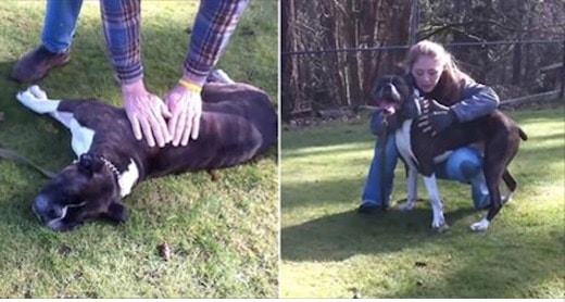 Ce moment qui aurait pu tourner au drame s’est déroulé durant un cours de dressage au Canyon Crest K9 Training Center dans l’état du Washington. Sugar, un boxer, s’est effondré et est resté inconscient pendant plus de deux minutes. Fort heureusement, il a été réanimé par Ron Pace, le propriétaire du centre qui lui a fait un massage cardiaque. Sugar a eu beaucoup de chance que Ron qui connait ces gestes de premier secours soit présent à ce moment là. Après un contrôle chez le vétérinaire, il s’est avéré que Sugar souffre d’une cardiomyopathie.
