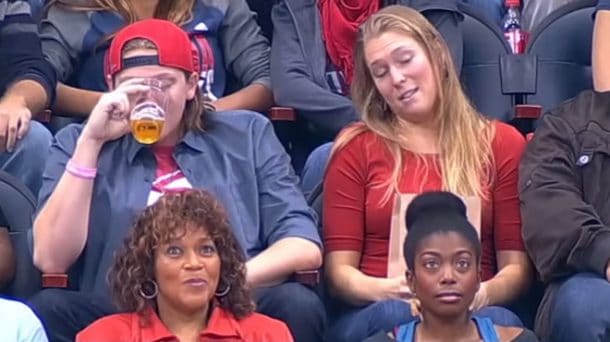 Oups, ça la fout mal, et devant des milliers de personnes. Ou comment crier à toute l’audience que votre couple, bah c’est plutôt Harley Quinn et Joker plutôt que Rose et Jack… Ouai, pas très cool. Eh bien figurez-vous qu’un type a réellement fait le coup à sa nana. Manifestement, il avait l’air bien plus intéressant par le contenant de son gobelet que par la bouche de belle. Il faut dire que le contenant contenait de la bière. On en est donc réduites à ça ? C’est moche. Sauf que la petite nana n’a pas dit son dernier mot. Après s’être pris un bon gros râteau devant tout le public, elle décide finalement de se rabattre sur le mec à côté d’elle. Ça n’a pas de prix, matez bien la réaction de son Jules.