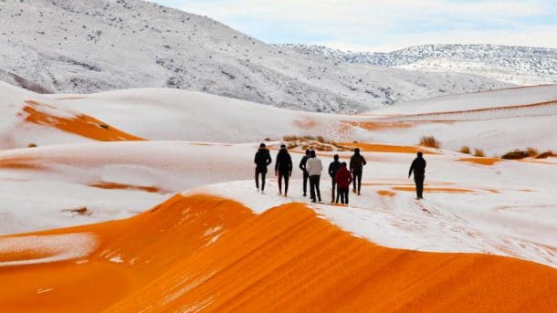 Dans la localité d’Aïn Sefra, dans le du désert du Sahara, les habitants ont pu connaître les joies de voir tomber des flocons de neige et de sentir sa douceur lorsqu’elle s’amasse aux pieds. C’est la quatrième fois que ces dunes rouges sont recouvertes de neige, en 38 ans. Trois fois auparavant, ils ont connu de la neige.