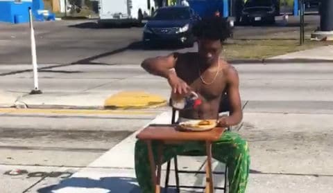 Le 21 avril dernier, Travis Riley filmait son pote, Kiaron Thomas. Jusque-là, rien de bien bizarre me direz-vous. Sauf que ce dernier, âgé de 21 ans, était tranquillement installé dans la rue et prenait son petit-déjeuner au milieu de la route. Et pas n’importe quel déjeuner, au menu : bacon grillé, œufs brouillés, pancakes au sirop d’érable. On voit d’ailleurs que les voitures tentent de contourner le glouton. Mais malheureusement, le jeune Thomas va être appelé à comparaître devant le Tribunal. En effet, ce comportement est jugé comme dangereux et nuit à la fluidité du trafic routier. En tout cas, la vidéo a déjà été visionnée plus 120 000 fois ! Les médias du coin n’y sont d’ailleurs pas totalement étrangers.