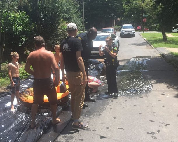 Ces derniers temps, les policiers américains ont tendance à faire le buzz, mais pas forcément pour de très bonnes raisons… Mais cette fois-ci, ces deux policiers ont changé la donne. Et pour cause, ils furent appelés le 4 juillet dernier dans un quartier d’Asheville, en Caroline du Nord. Les habitants du quartier célébraient alors la fête nationale des États-Unis. Et un papa avait installé un toboggan géant fait de bâches en plastique pour que les enfants du quartier puissent s’amuser. Afin d’être un peu en pente, le toboggan improvisé avait été installé le long de la rue. Et l’un des voisins a contacté les forces de l’ordre pour se plaindre que le toboggan bloquait la rue. Il s’est également plaint du bruit. Quoi qu’il en soit, les policiers sont donc arrivés sur place pour constater les faits.