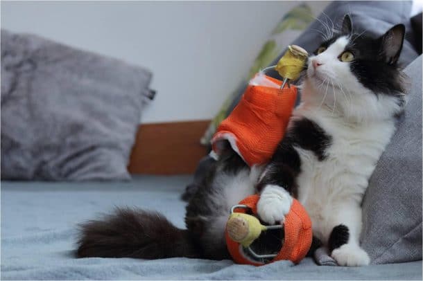 Il a été recueilli par l’association Let’s Adopt à proximité d’une voie ferrée en Bulgarie. Aujourd’hui, on peut clairement dire que ce chat revit grâce à ces deux prothèses. Celles-ci sont faites de caoutchouc et de polymère et sont montées sur titane. Il a maintenant l’avantage de retrouver une certaine mobilité. Bien sûr, ce n’est pas parfait, mais c’est mieux que s’il ne les avait pas du tout. Le vétérinaire nous confirme d’ailleurs que bien qu’il doive encore s’habituer à ses nouvelles prothèses, son état est très rassurant. Pooh peut sauter et même courir. Et il joue, tous comme les autres chats !