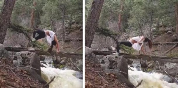 C’est donc en équilibre sur un tronc d’arbre plutôt mince qu’elle a entrepris de prendre cette posture. Le tout, juste au-dessus d’une rivière dont le courant est assez fort. Malheureusement, la jeune femme va perdre l’équilibre et finir à l’eau. Les choses auraient pu mal tourner, si elle s’était cognée la tête au fond de l’eau ou si elle avait été entraînée par le courant. Heureusement, elle s’en tire bien et n’a pas été blessée lors de cet incident. Elle a même eu la gentillesse de partager ce moment hilarant avec nous ! On vous laisse découvrir la scène.