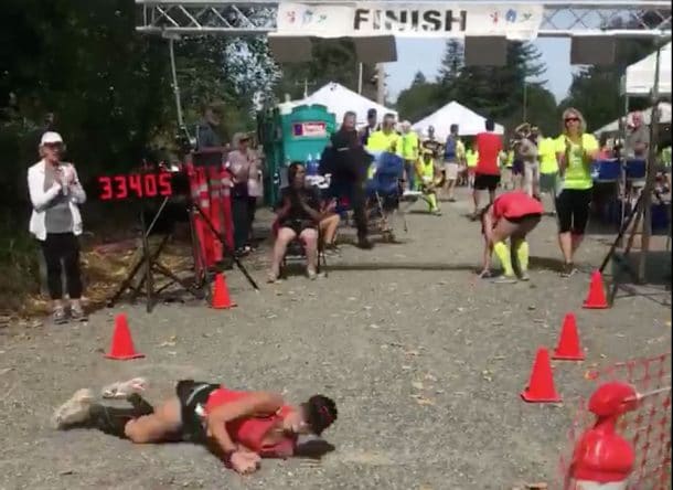 La sportive, prise de crampes sévères, voit son rêve s’effondrer devant elle. Mais elle est extrêmement motivée et essaie de ramper sur les derniers mètres. Elle n’y arrive même pas. La dernière solution qu’il lui reste, est de rouler, telle une saucisse sur un terrain en pente. Son arrivée particulière a été filmée par Philip King, un spectateur qui a assisté à la scène. Il a posté sa vidéo sur Facebook ne sachant pas qui était la jeune sportive.