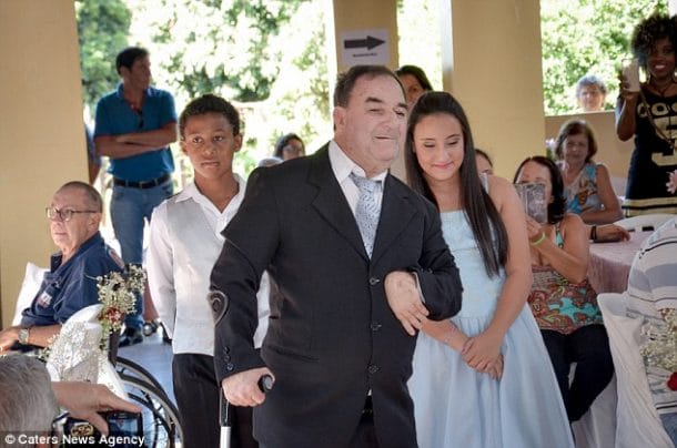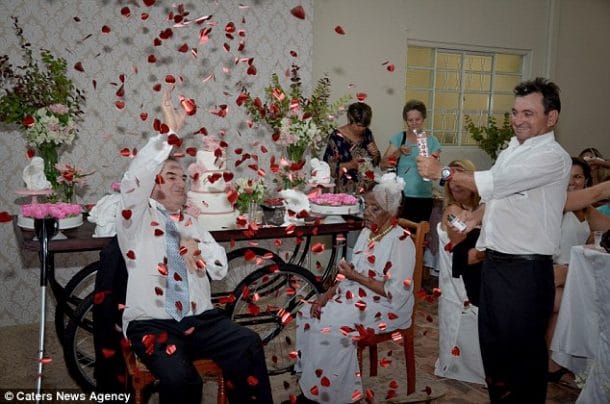 Ils se sont rencontrés dans la maison de retraite de Pirassununga, au sud-est du Brésil. Et leur relation, c’est du sérieux ! Cela fait déjà 3 ans qu’ils sont ensemble. Comme à cet âge le temps presse, pas question d’attendre encore quelques mois de plus avant d’officialiser la relation. Les deux tourtereaux ont scellé leur union dans la maison de retraite, entourés de tous les pensionnaires. Les médecins étaient présents, au cas où l’ascenseur émotionnel eut été trop fort et fatal pour l’un des deux époux. Mais tout s’est déroulé pour le mieux et quand on regarde les photos de la cérémonie, on remarque la joie immense sur le visage des deux mariés.