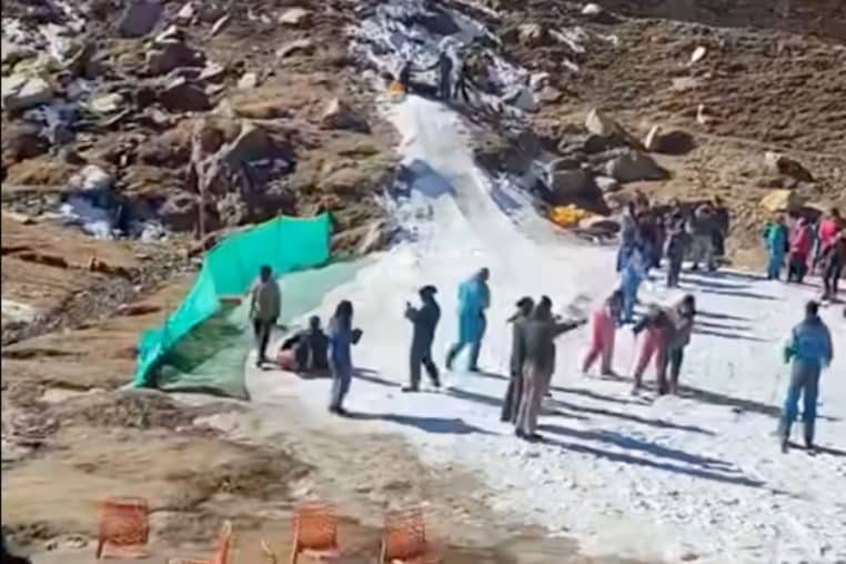 La scène, filmée sur place, montre des visiteurs en tenue de ski, glissant sur quelques mètres seulement de neige. L’illusion d’une station complète est immédiatement dissipée.