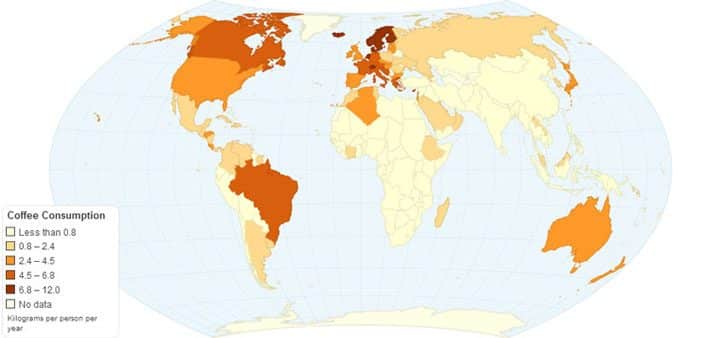 La carte du monde de la consommation de café en kilogramme par personne