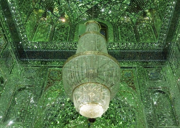 D’un point de vue extérieur, jamais vous ne pourriez imaginer à quoi ressemble l’intérieur de cette mosquée. Je n’y croyais pas non plus, puis lorsque j’ai vu les photos, j’ai compris… En apparence, c’est une mosquée tout à fait banale. Le monument funéraire Shah Cheragh fait également office de mosquée à Shiraz, en Iran. En français, le nom du lieu signifie également « Roi de la lumière », et on comprend bien pourquoi.